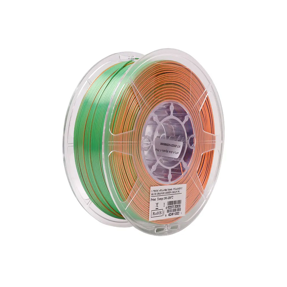 • Filamento Multi-Colorido: O filamento ePLA-Silk Mystic oferece um incrível efeito dinâmico através de um gradiente entrelaçado de três cores. Com uma textura de brilho sedoso, a superfície é lisa e não mostra padrões de camadas.