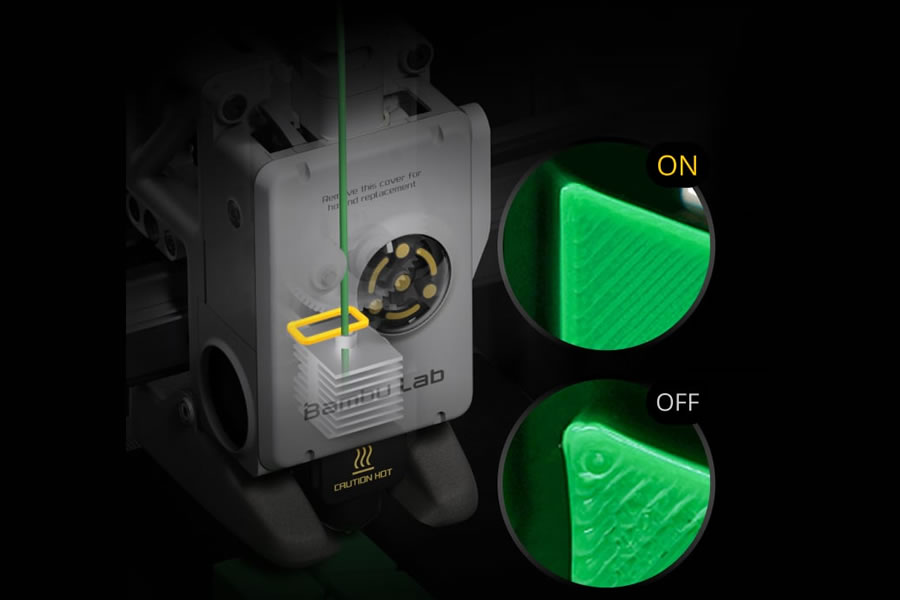 O A1 mini revoluciona o controle de fluxo na impressão 3D. Ele utiliza um sensor de correntes parasitas de alta resolução e alta frequência para medir a pressão no bico. Nosso algoritmo compensa ativamente a taxa de fluxo de acordo com as leituras para extrudar com precisão.