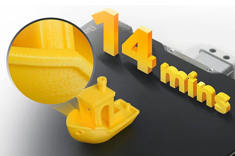Trilhos totalmente metálicos, estrutura rígida, sensor de pressão do bico, acelerômetros, MCU poderoso e, acima de tudo, um sistema avançado de controle de movimento que utiliza esses recursos para imprimir uma bancada de 14 minutos com qualidade e seguindo todas as regras de bancada de velocidade direto do caixa sem usar filamentos especializados.