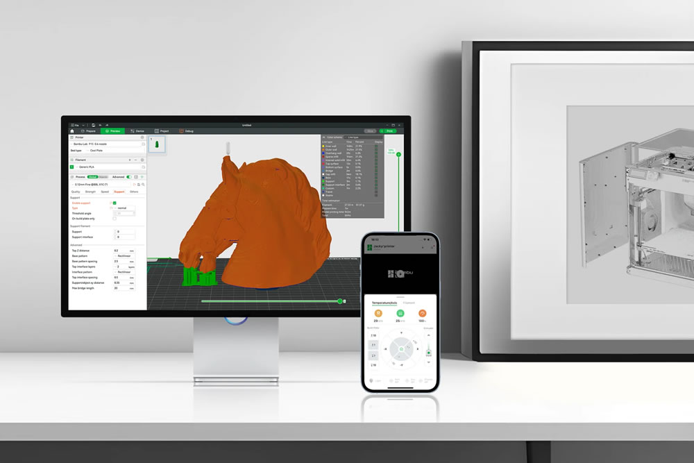 Controle e monitore remotamente sua impressora no Bambu Studio ou no Bambu Handy. Através da câmera integrada, você também pode gravar vídeos em timelapse.