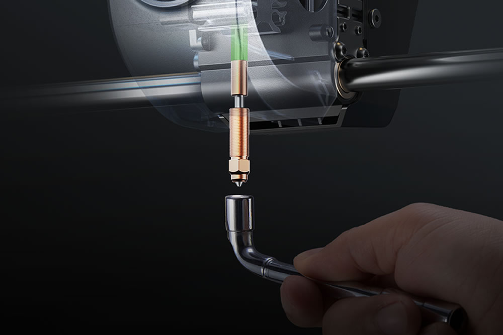 Um poderoso aquecedor de cerâmica envolve o hotend.